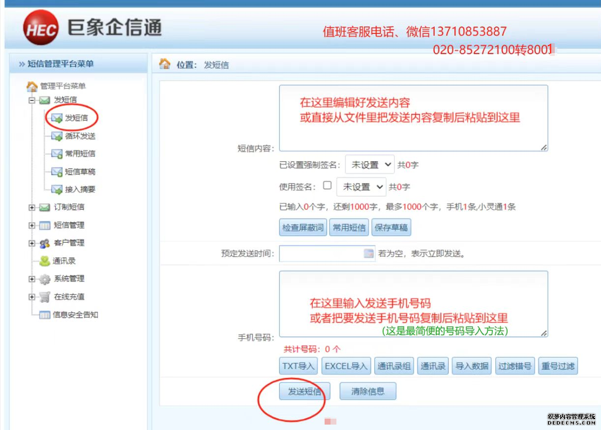 三、常規批量短信群發操作,即發送對象收到的內容都一樣,如會議通知、公告通知等,操作方法如下。